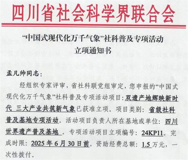 本网讯(文、图/孟凡帅、乔恒忠)近日,四川省社会科学界联合会“中国式现代化万千气象”社科普及专项活动立项名单发布,四川世界遗产普及基地喜获立项。