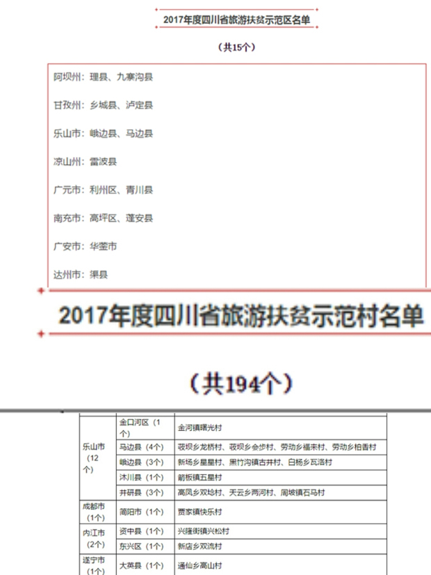 近日,从四川省旅游发展委和四川省扶贫移民局共同审议、公示的文件中得知,有15个县区、194个村入选四川省级旅游扶贫示范。乐山市峨边县、马边县2个县入选2017年度四川省旅游扶贫示范区,乐山市有12个村入选2017年度四川省旅游扶贫示范村,主要有沐川县箭板镇五星村、井研县高凤乡双埝村、峨边县新场乡星星村、黑竹沟镇古井村等。