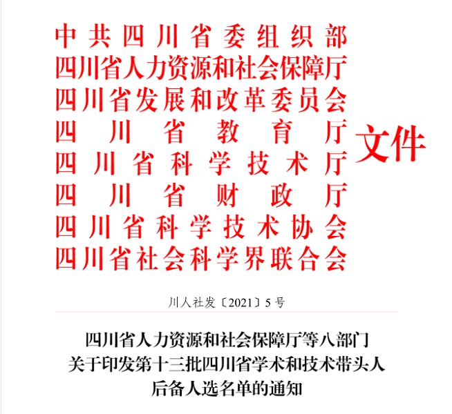 根据四川省人力资源和社会保障厅等八部门《关于印发第十三批四川省学术和技术带头人后备人选名单的通知》(川人社发[2021]5号)文件,经各部门推荐,同行专家评议,省委组织部、省发改委、省教育厅、省科技厅、省财政厅、省人社厅、省科协、省社科联等部门研究,全省1144名同志被批准为第十三批四川省学术和技术带头人后备人选。其中,贝博官网院长郭剑英入选,荣获四川省第十三批学术和技术带头人后备人选称号。