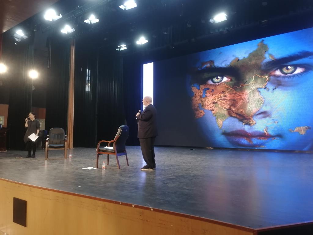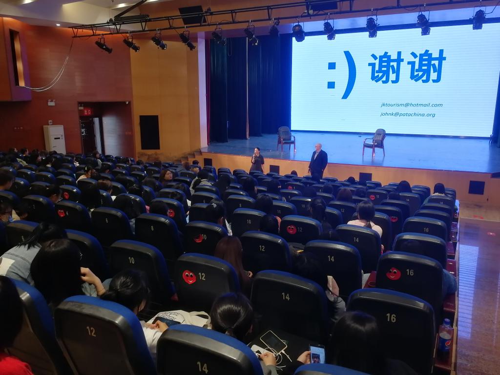 (文图/陈金龙)11月12日下午,由旅游学院主办的2020级新生“专业导论与职业生涯规划”课程专家讲座在学校多功能厅顺利召开。旅游管理专业负责人陈金龙副教授主持讲座,乐山师范学院旅游学院外籍专家、亚太旅游协会首席执行官特别顾问张科德(John Koldowski)主讲,乐山伊桥幼儿园(筹)外语教师司冬玲担任翻译。旅游学院王瑛教授、2020级全体新生、部分2019级学生参加了讲座。