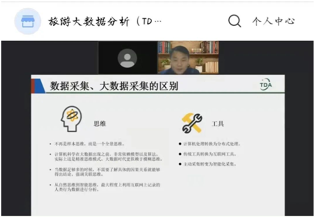 (图、文/夏军)3月24日-3月28日,为进一步科学构建各高校技能型、数字型骨干教师队伍,全面提升高校教师“数智素养”及数字化实践能力。由上海棕榈电脑系统有限公司主办、重庆开放大学(重庆工商职业学院)承办的“1+X旅游大数据分析职业技能等级证书师资、考评员培训班”顺利举办。由于疫情影响,此次培训改为线上进行,旅游学院教师段捷、夏军参加了此次培训。