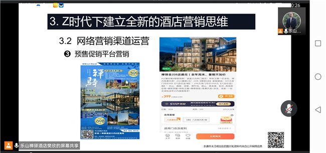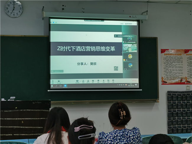 本网讯(文、图/王瑛)5月24日晚,由BB贝博艾弗森官方网站主办的《旅游消费者行为》课程实践周专家讲座在行知楼517教室顺利举行。酒店管理专业负责人王瑛教授主持讲座,乐山师范学院BB贝博艾弗森官方网站外聘专家、乐山禅驿酒店总经理樊欣主讲,主题是《Z时代下酒店营销思维变革》。学院院长助理孙永兴博士、酒店管理专业系主任秦容副教授和2019级旅游管理6班全体同学、2019级酒店管理专业部分同学在线参加了讲座。
