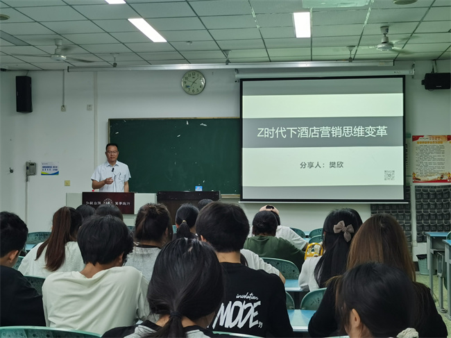 本网讯(文、图/王瑛)5月30日晚,BB贝博艾弗森官方网站邀请学院外聘专家、四川禅驿集团品牌文化总监、乐山禅驿酒店总经理,学校93级优秀校友樊欣在行知楼213教室为2023级旅游管理专业全体同学以《Z时代下酒店营销思维变革》为题开展讲座。