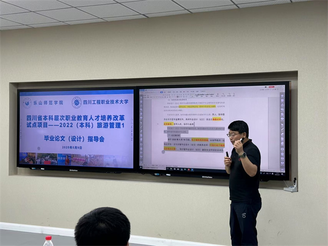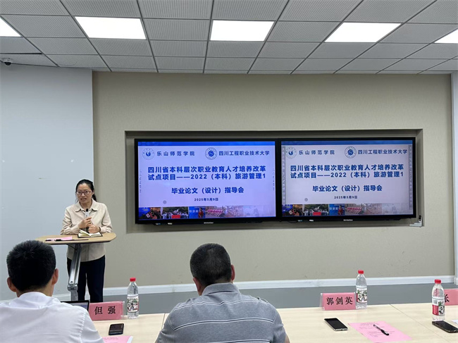 本网讯(图、文/孙永兴)5月9日,乐山师范学院、四川工程职业技术大学四川省本科层次职业教育人才培养改革试点项目——2022级(本科)旅游管理1班毕业论文指导会在四川工程职业技术大学举行。会议由四川工程职业技术大学旅游管理学院副院长朱洪端主持,四川工程职业技术大学旅游管理学院党总支书记余立勤、院长张伟、毕业论文指导教师代表、2022级(本科)旅游管理1班全体同学参加了会议。BB贝博艾弗森官方网站党委副书记、院长郭剑英,副院长但强、副院长孙永兴和教学科研科科长张力参加了指导会。