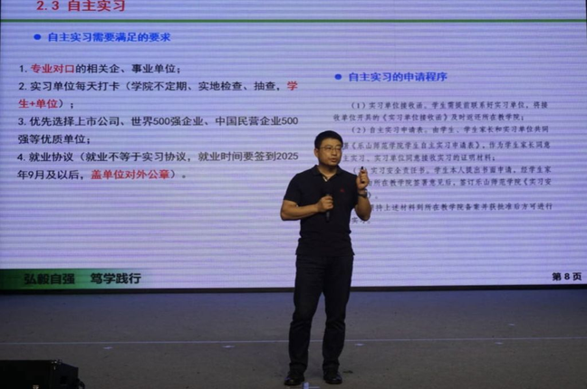 孙永兴从专业实习的目的与要求、专业实习管理分类、专业实习档案管理、毕业论文要求四个方面就学生实习工作作了详细说明,列举了多个实习单位供同学们选择,要求同学们在实习期间要高度重视和认真对待实习工作,严格遵守实习相关规定和制度,保质保量完成实习任务。同时,他叮嘱同学们要认真对待毕业论文,在实习的同时加强与论文指导老师的沟通交流,按进度推进毕业论文撰写工作。