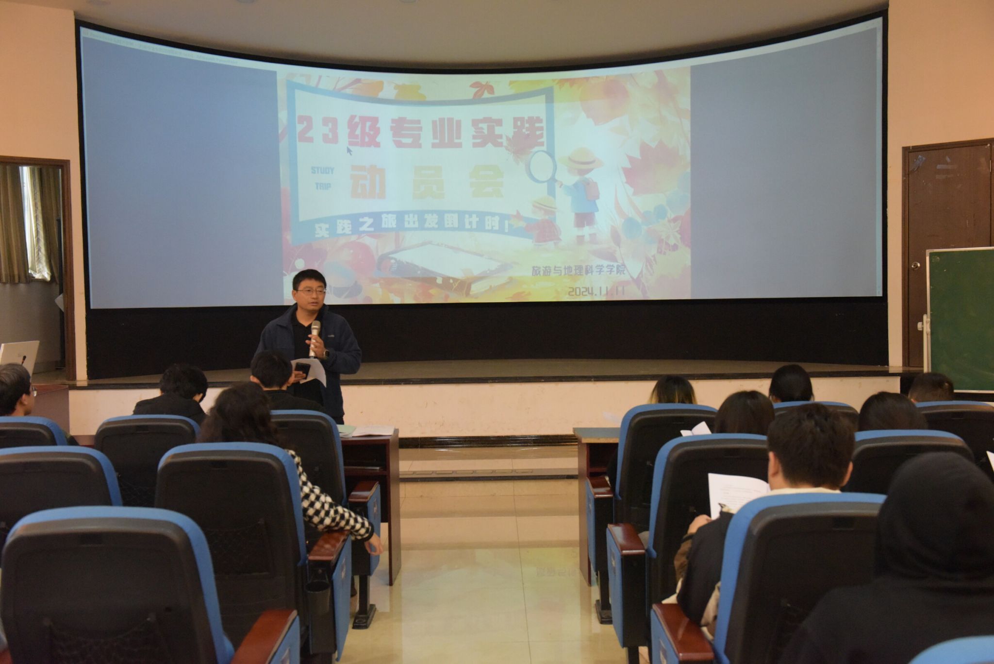 本网讯(文/杨洋、图/卿婷)11月11日,BB贝博艾弗森官方网站在旅院楼3D教室召开了专业实践动员会。学院党委副书记、院长郭剑英,带队老师,2023级旅游管理、人文地理与城乡规划、酒店管理三个专业的学生参加了会议。会议由学院副院长孙永兴主持。