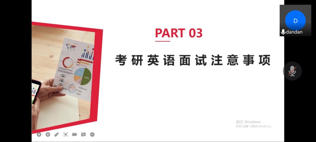 杨丹从考研英语面试的自我介绍、常提问题以及注意事项三个方面对考研学子进行英语复试指导,为同学们纠正英语单词的发音,完善自我介绍的内容,对面试的礼节礼貌等注意事项作了讲解。杨婷婷、巫瑞和张琳分别从材料准备、复试流程、调剂方法等方面分享了他们的经验,建议同学们去了解院校的公开复试材料、时事热点,同时要注意个人简历的格式和邮件内容要求,以平稳的心态应对复试。