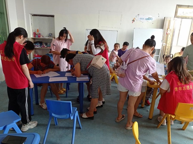 在7月3日的活动宣传结束后,青春伴成长志愿服务队于7月4日早上便前往五通桥区各服务站点进行现场的活动报名,并签署相关安全责任书。在本次活动中共有120多名小朋友报名参加由该团队组织的暑假公益班。