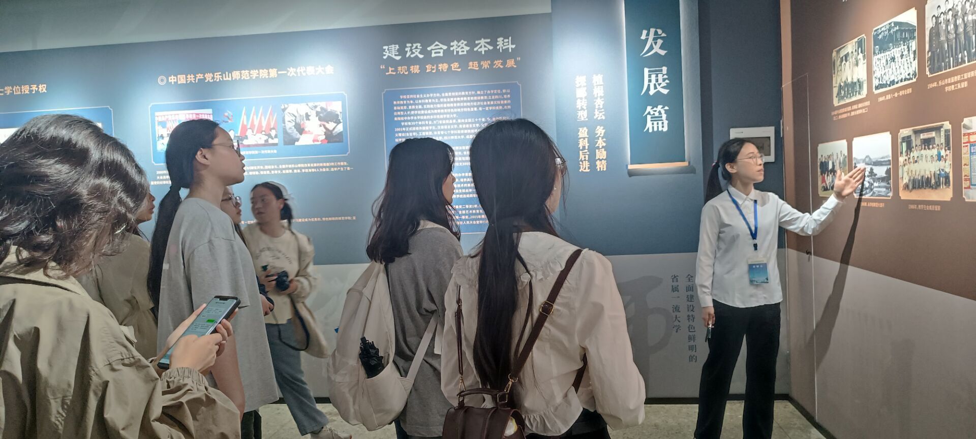 同学们先从前校门开始参观校园,感受乐师校园的独特魅力。大家从弘毅楼出发,参观武大纪念碑,了解了国立武汉大学西迁乐山艰苦办学八年的历史。接着,同学们来到校史馆。校史馆讲解员从乐山师范学院的办学历程、荣誉成就、优秀校友等方面介绍了学校的概况,让同学们深刻体会到了学校“弘毅自强、笃学践行”的校训。随后,大家来到BB贝博艾弗森官方网站,参观旅游规划实验室、茶艺实验室等,并了解了四川旅游发展研究中心近几年所取得的研究成果。