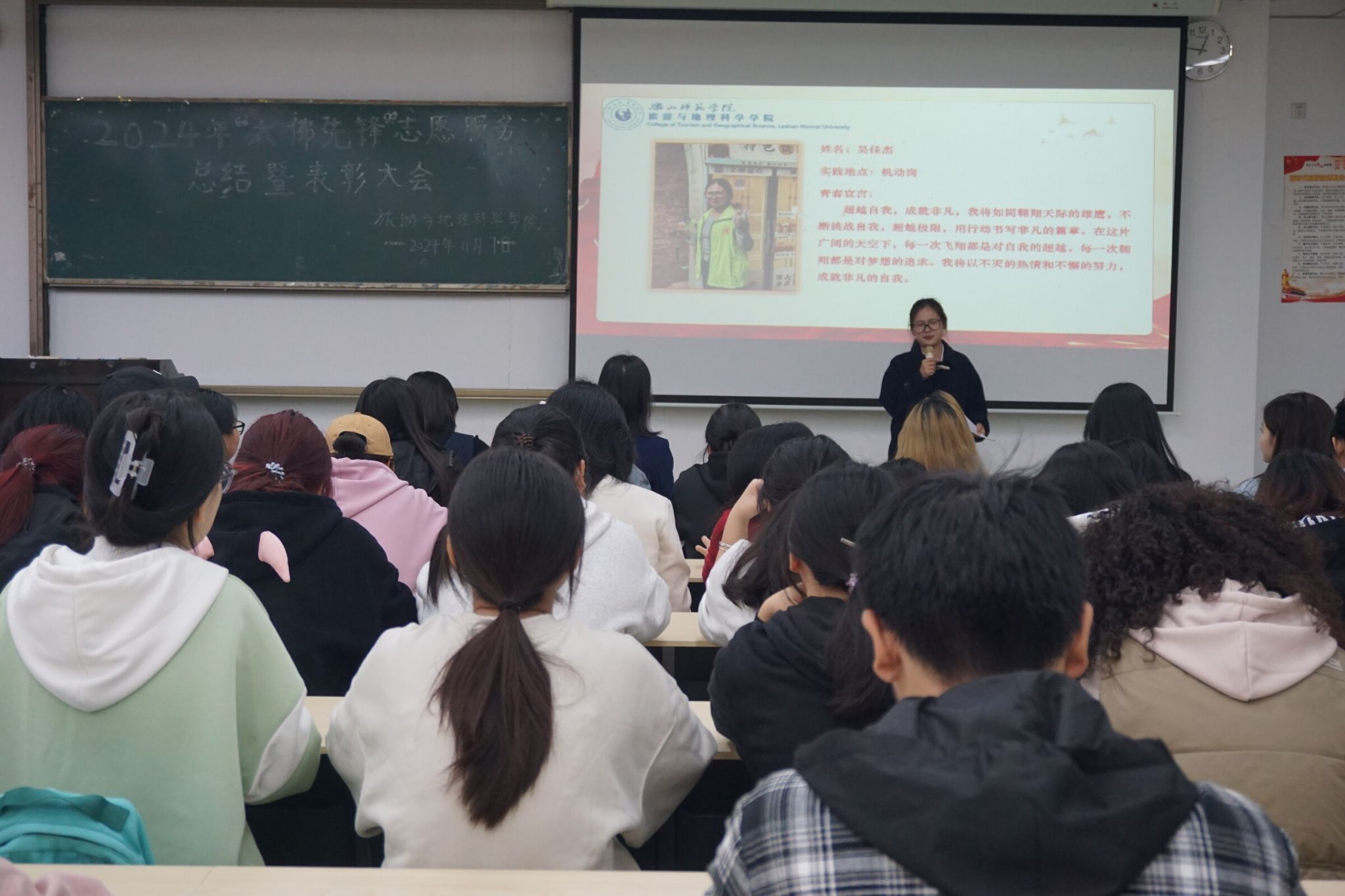 在热烈的掌声中,2024年“大佛先锋”志愿服务总结暨表彰大会拉开了序幕。三位优秀景区服务志愿者分别分享了在七天的志愿服务工作中的收获和成长。徐秀云和江纳为吴佳杰、张澜、隆吉欢等获得“最美志愿服务之星”“最佳宣传视频奖”“优秀摄影作品奖”“最佳实践报告奖”“最佳志愿服务团队奖”称号或奖项的同学们颁发了奖状并合影留念。