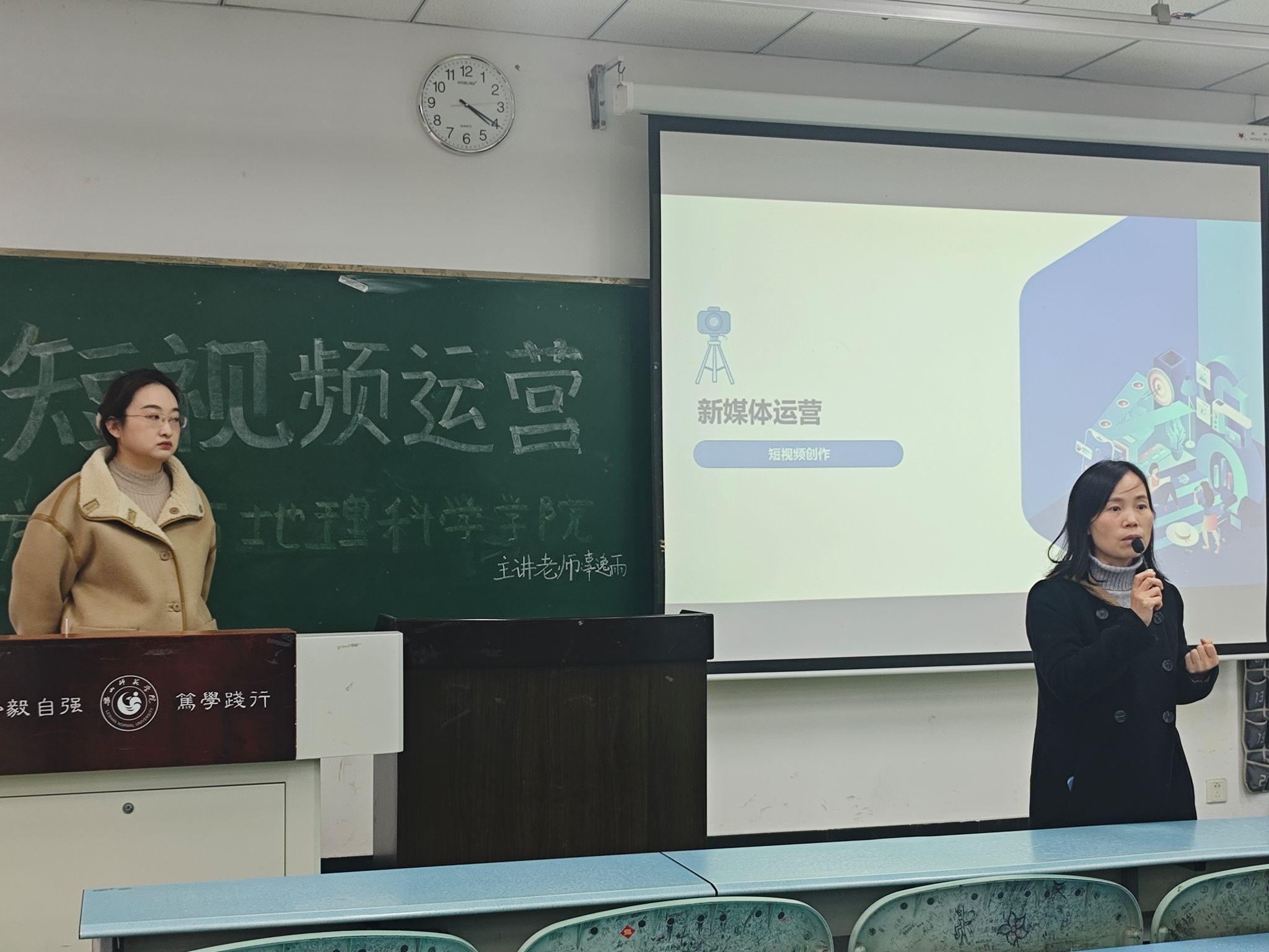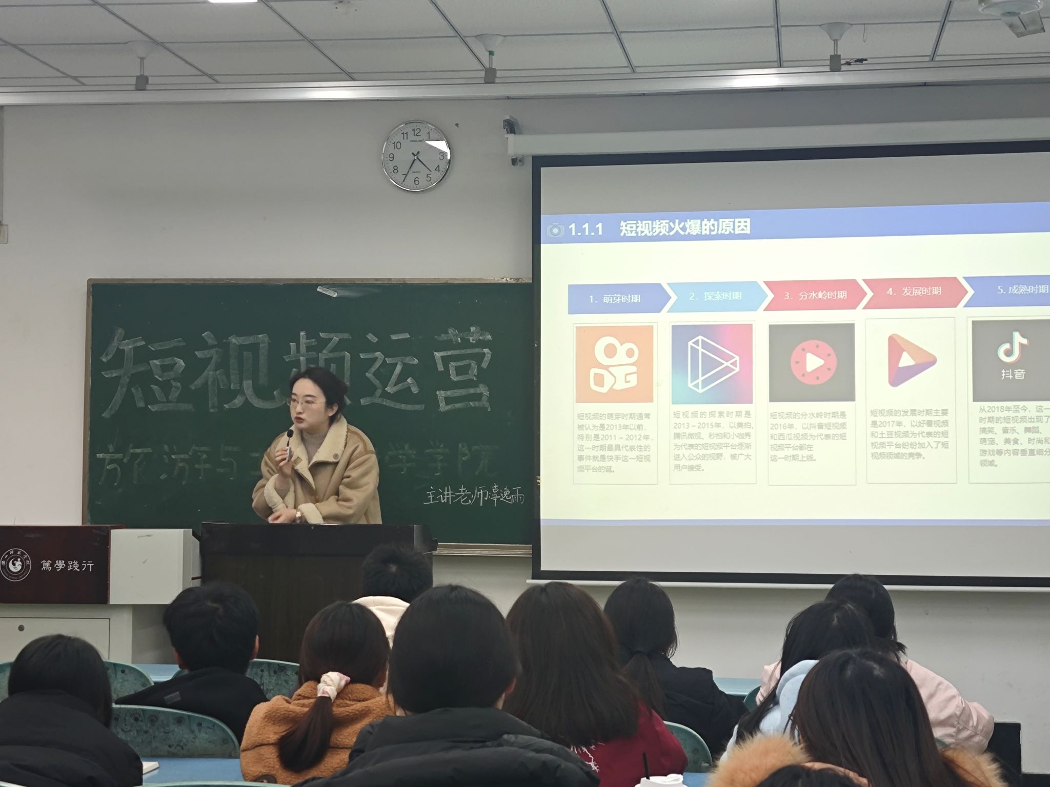 本网讯(文/王小龙、图/杨光)12月5日下午,BB贝博艾弗森官方网站于行知楼210教室组织开展了主题为“短视频运营”的培训。学院党委书记徐秀云,学生工作办公室主任、分团委书记江纳莅临培训现场。美术与设计学院教师辜逸雨为学院实践特色班和青年传媒中心的同学们做了专题讲座。