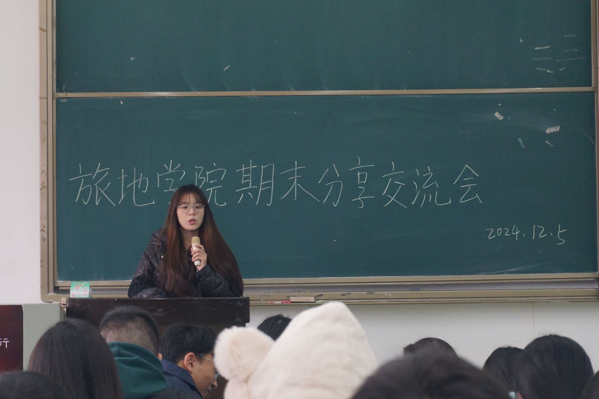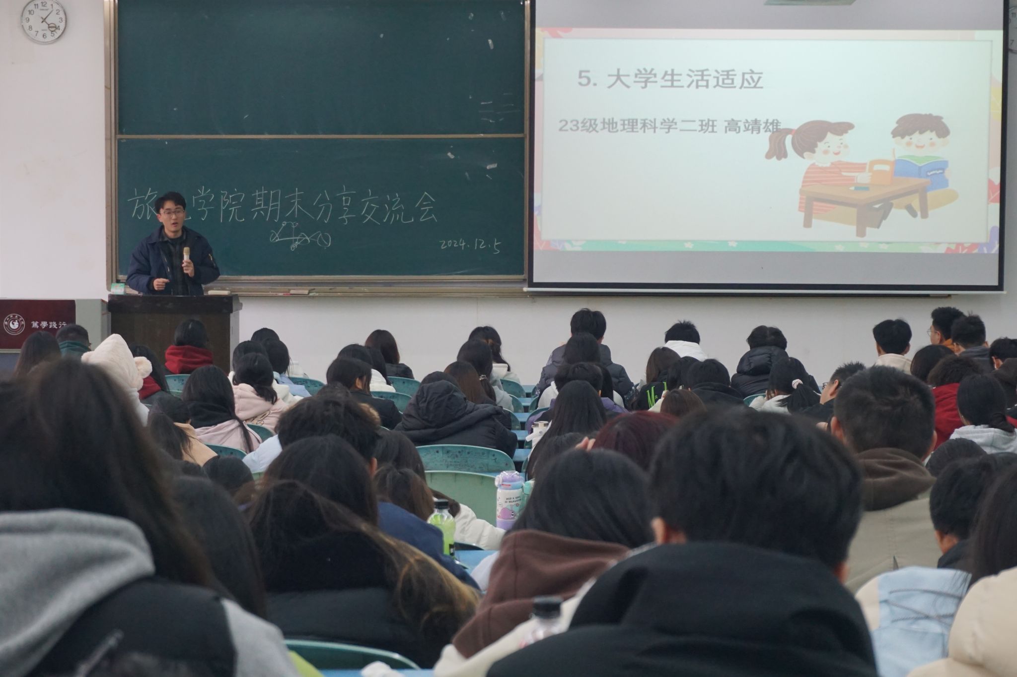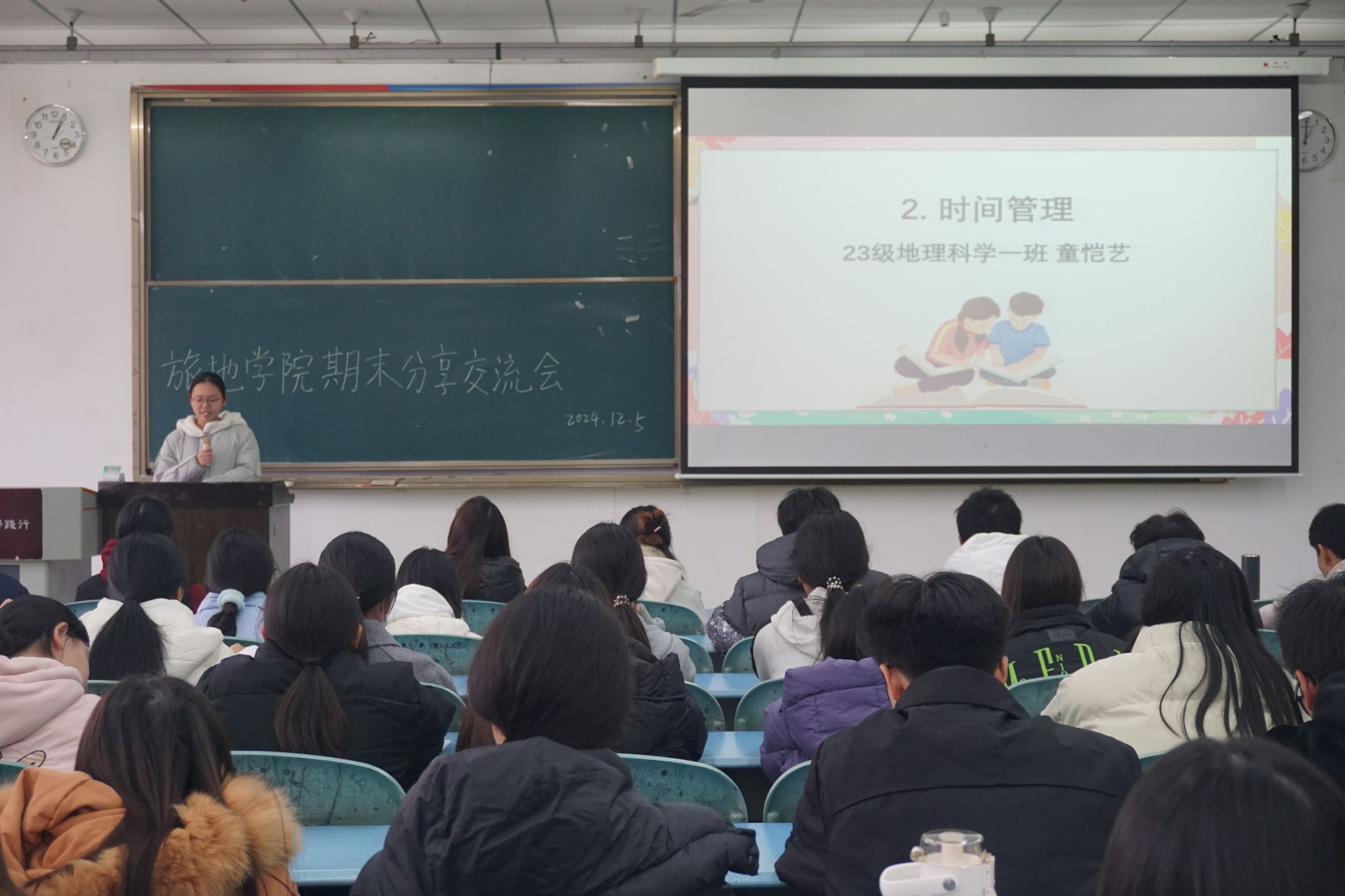 本次会议围绕分享经验、启迪思维、共促成长三个方面展开,23级师兄师姐们从不同角度给24级新同学们分享了他们的学习方法、备考经验以及如何应对期末考试的压力和焦虑。旅游管理一班李淑怡从了解期末考试安排、制定明确可行的复习目标、学会总结各学科重难点等方面为大家的复习之路提供了有益的参考。地理科学一班童恺艺强调合理分配时间的重要性,充分利用碎片化时间以提高学习效率。人文地理与城乡规划一班汪娟提醒大家在考前应该关注自身身体健康,确保充足的睡眠,以积极良好的心态去迎接考试。酒店管理一班甘思蕊则从心理调节、情绪管理等方面告诉大家要学会减少压力,鼓励大家培养自己的兴趣爱好。地理科学二班高靖雄结合自己亲身经历讲解了如何在大学生活中提升自律意识,积极拓展大学生活的宽度。