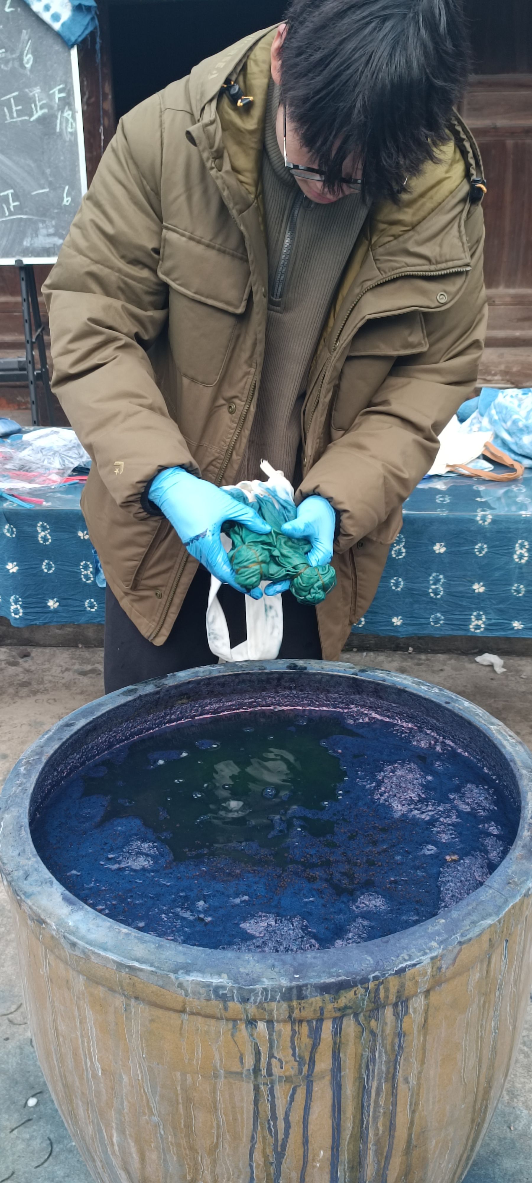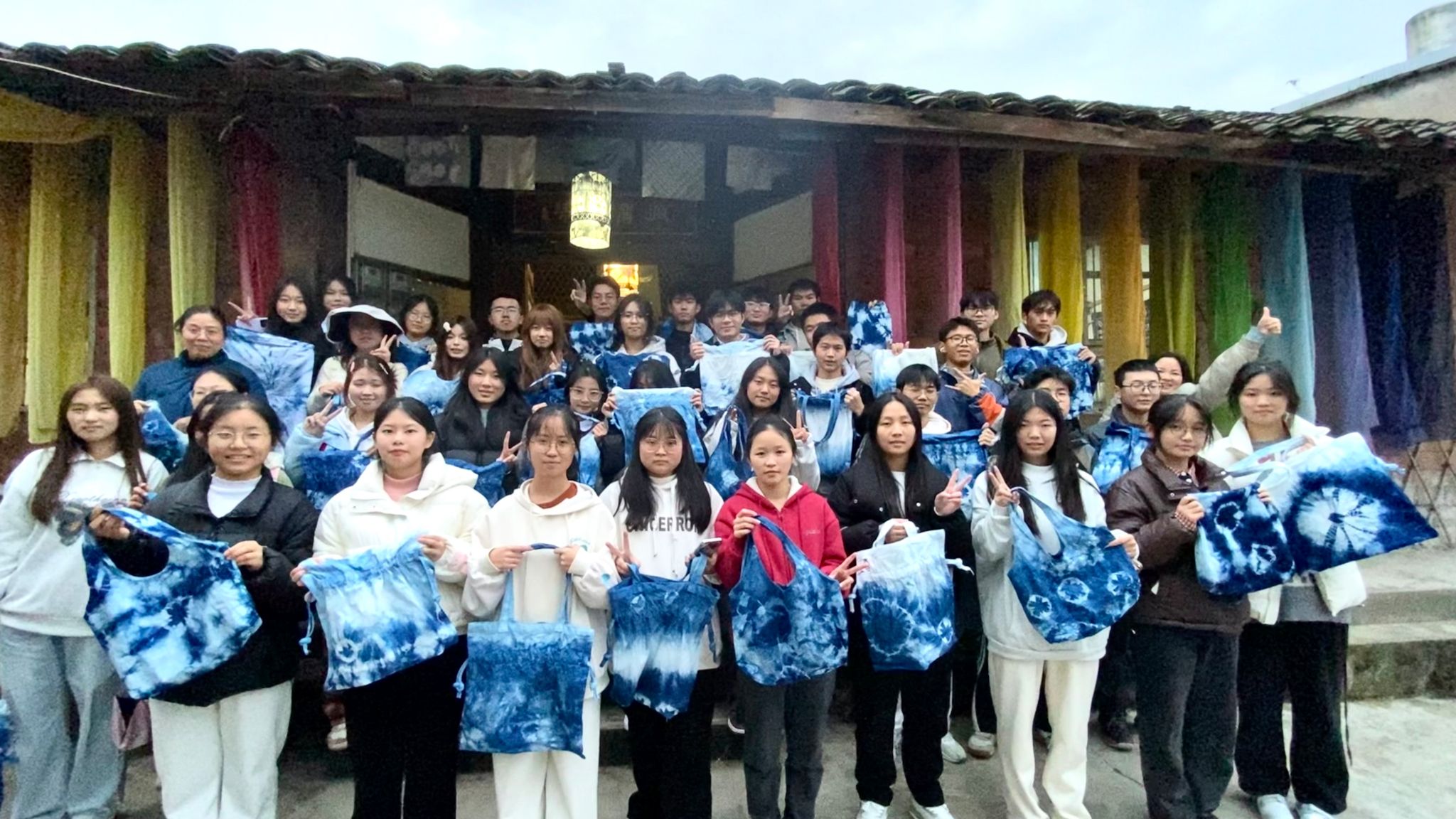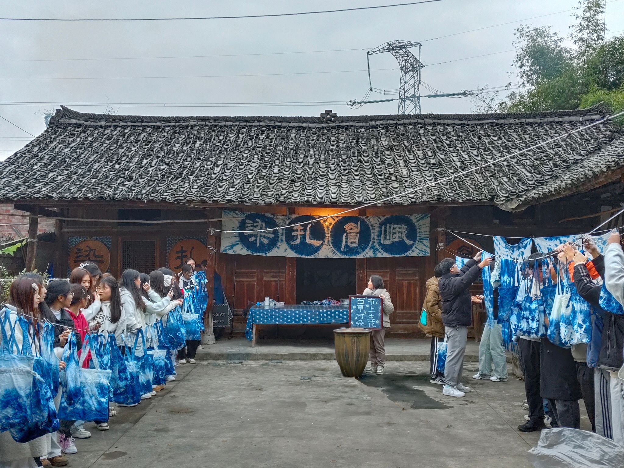 同学们在峨眉扎染传统技艺传承人王永清王老师的引领下,走进了充满艺术气息的扎染工作室。王老师首先介绍了扎染的历史渊源和工艺流程,并现场演示了扎染的基本技巧。同学们听得津津有味,迫不及待想要亲自动手尝试。大家根据自己的创意构思,将布料或衣物进行折叠、捆绑、夹紧,设计出各式各样的图案。有的精心扎出细密的小疙瘩,力求染出繁星点点的效果;有的大胆采用大幅折叠,期待呈现出流畅自然的纹理。随后,大家将扎好的织物放入染缸,耐心等待色彩的渗透与晕染。当一件件浸染完成、拆去扎线的作品逐一呈现时,现场不断响起惊喜的呼声。每一件扎染作品都独一无二,其色彩或明艳或淡雅,图案或规整或奔放,无不展现出参与者们丰富的想象力和创造力。在这个过程中,同学们不仅体验了如何开展研学,提升了专业技能,也锻炼了动手能力,体会到劳动的辛苦与快乐。