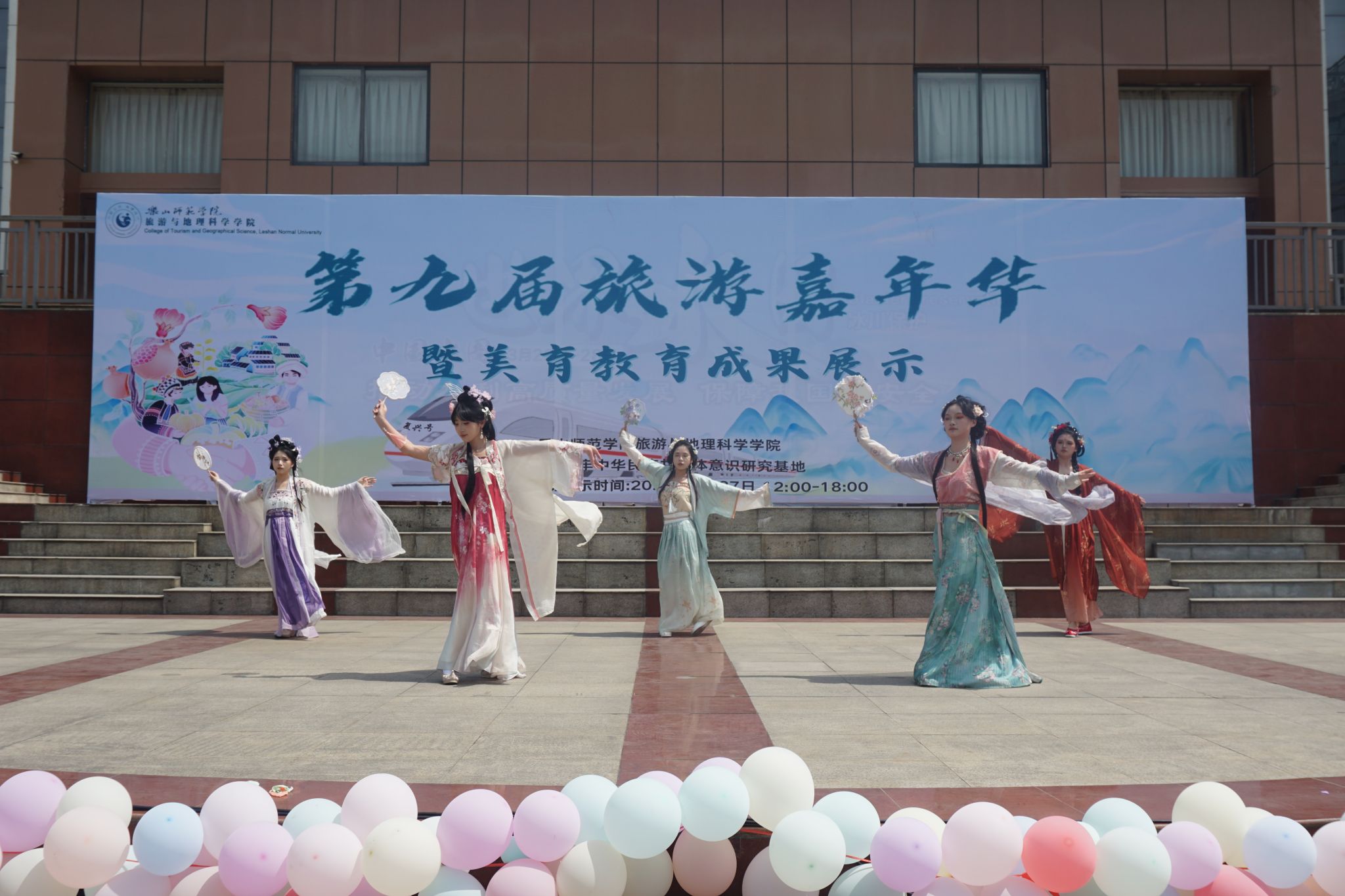 活动以"通往幸福的路:民族地区与乡村旅游的探索与发现"为主题,通过丰富多彩的形式展示美育教育成果和民族文化特色。旅地学院党委书记徐秀云在开幕式上致辞。她表示,本次活动立足创新育人理念,将美育教育融入专业实践,通过体验各民族特色文化,促进文化交流与理解,实现"以美育人、以文化人"的教育目标。活动践行“五育并举”方针,为学生德智体美劳全面发展提供实践平台。本次活动形式新颖、内容丰富,包括民族歌舞表演、六个特色旅游展厅展示、导游讲解、旅行分享会、旅游产品展示、互动体验、特色美食品尝等环节。活动充分发挥学院专业优势,创新美育教育形式,通过多元展示提升美育工作实效。
