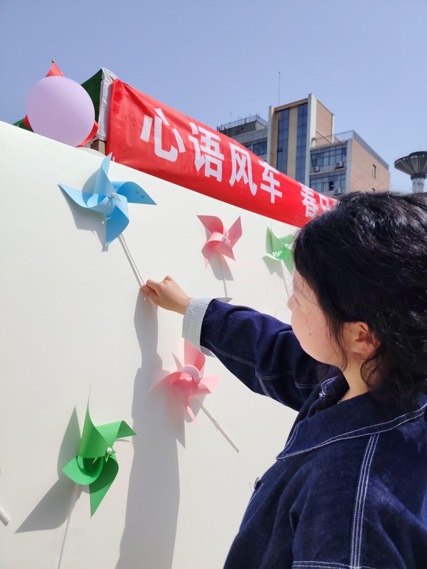 在春季心理健康分享环节,工作人员结合季节特点,为同学们讲解了如何通过自我关怀与情感表达缓解压力、提升幸福感。随后的风车制作环节,同学们热情参与,裁剪、折叠、装饰……每一步都凝聚着专注与创意。风车叶片上,有的同学写下“愿自己勇敢追梦”,有的同学写下“感谢朋友的陪伴”,还有同学绘上星星、花朵等图案,让每一只风车都成为独一无二的作品。
