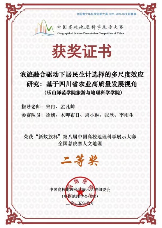 贝博官网“蜀农兴旅队”的参赛作品《农旅融合驱动下居民生计选择的多尺度效应研究——基于四川省农业高质量发展视角》,聚焦乡村振兴背景下的农旅融合发展路径,通过多尺度实证分析,展现了地理学在解决现实问题中的独特价值。在激烈的角逐中,团队以扎实的学术功底、清晰的逻辑表达和创新的研究视角脱颖而出,最终斩获人文地理组全国二等奖,彰显了贝博官网地理学科的教学成果和学生的综合素养。