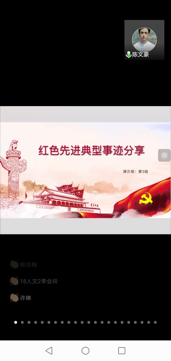 本次活动由来自18级的陈垚负责流程串讲,党校学员以小组为单位选出代表进行PPT展示。全体学员分为四个小组围绕近现代先辈们的先进典型事迹进行论述。通过屏幕分享,结合时事层层导入分析让同学们深入了解,忆古思今。