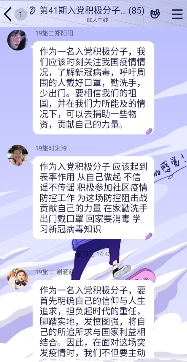 此前,旅游学院分党校已经举办了第四十一期入党积极分子培训开班典礼和第一次理论课学习。本次线上讨论以小组为单位,组织学员在群里发表自己的感悟。学员们踊跃发言,纷纷围绕主题发表自己的看法。大家谈到了要从自身做起,主动响应号召投入疫情防控工作,为疫情防控贡献自己的一份力量。大家将我们国家应对疫情的措施与其他国家进行了对比后,充分体会到了我们国家制度的优越性,更加坚定了加入中国共产党的决心。