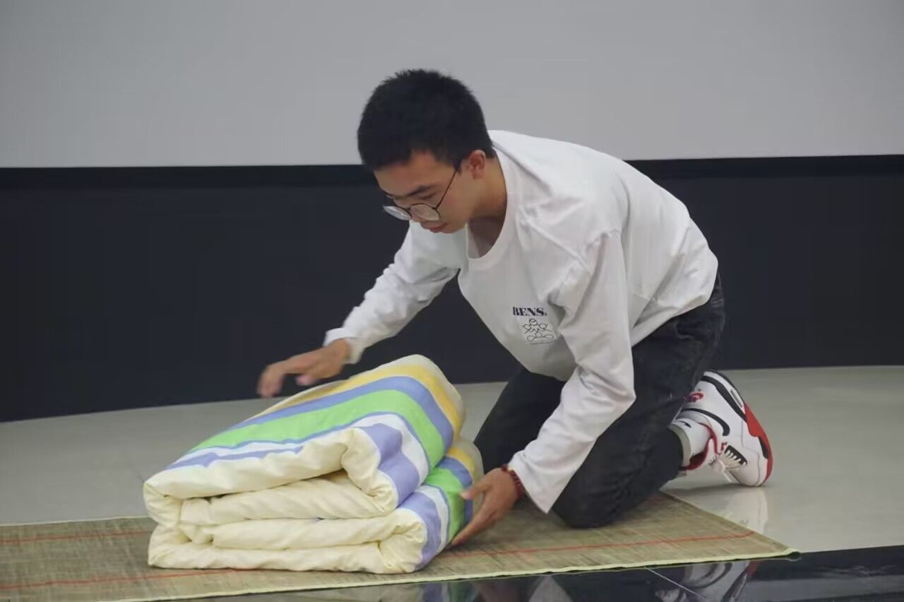 主持人宣布比赛规则及评分标准后,本次比赛拉开序幕。参赛选手们争分夺秒,耐心细致地叠军被,把一床床被子叠得棱角分明、厚度均匀。在第一轮激烈的比赛后,9位实力强劲的选手脱颖而出,进入决赛。评委们认真评审两轮比赛,最终得出获奖名单,其中魏柔云获得一等奖。学生分会、青年传媒中心、分团委的学生干部们为获奖同学颁发了奖状。