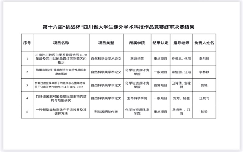 此次竞赛中,全校有36项立项项目进行了校内终审,共有15项通过了校内终审,其中有两个是旅游学院的立项项目。这两个立项项目分别是认定为“重点项目”的由李彤彤等人完成的“川南地区白垩系碎屑锆石U-Pb年龄及四川盆地丹霞红层物源区的指示”自然科学类学术论文,其指导老师是乔恒忠老师和代丽老师;以及被认定为“一般项目”的由贾于力等人完成的“疫情背景下旅游者消费心理及行为变化特点及趋势的调查报告”哲学社会科学类社会调查报告和学术论文,其指导老师是刘延超老师。