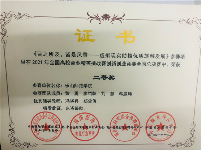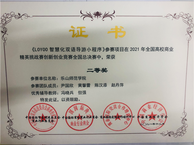 本网讯(图、文/尹国欣 )近日,2021年全国高校商业精英挑战赛创新创业竞赛全国总决赛在线成功举办。此次竞赛是由中国贸促会商业行业委员会、中国国际商会商业行业商会、商业国际交流合作培训中心与中国商业经济学会共同主办的面向在校大学生的综合类赛事。贝博官网冯晓兵、但强、郑曾俊老师指导的两支学生队伍进入了“创客组”全国总决赛,经过线上的视频展示和答辩两个环节,两支学生队伍的参赛项目《目之所及,皆是风景——虚拟现实助推优质旅游发展》《LOYOO智慧化双语导游小程序》喜获“创客组”全国总决赛二等奖。