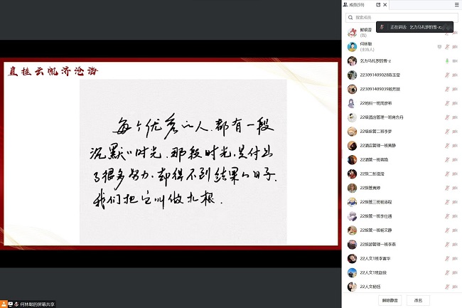 本网讯(文、图/鲜银香)为深入学习贯彻习近平新时代中国特色社会主义思想,在学院营造良好的典型引领、共同奋进的良好氛围,5月29号下午,BB贝博艾弗森官方网站十佳青年学生赵丹萍通过腾讯会议为学院22级师弟师妹们分享了她大学期间的成长经历。