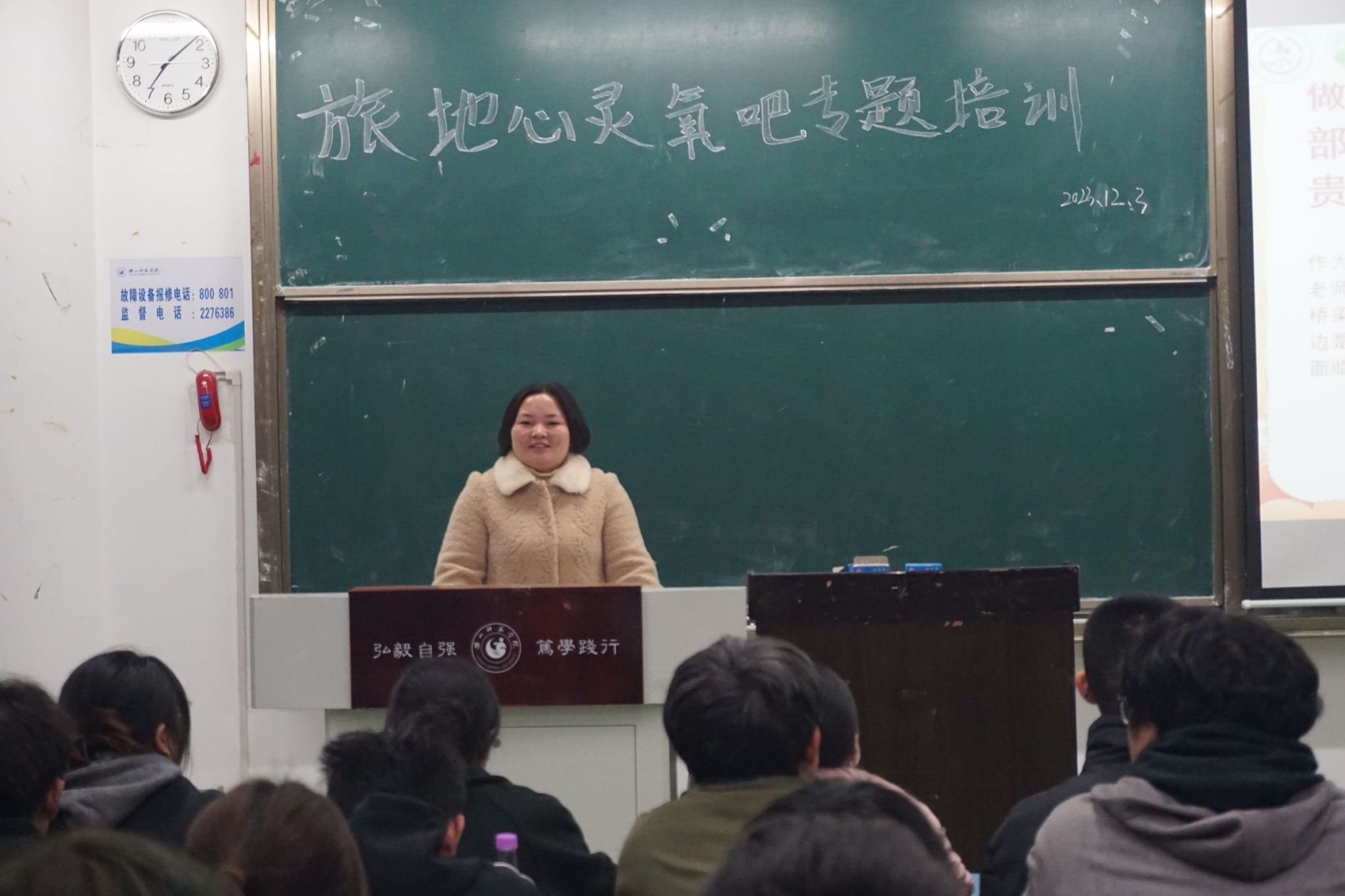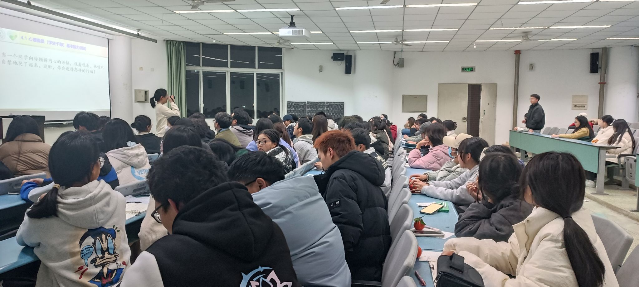 本网讯(文/王李驹 图/林海珍)12月3日,BB贝博艾弗森官方网站在行知楼114教室举办了以“学生干部心理压力疏导”为主题的培训。23级全体班干部、代理班主任、团学干部代表参加了此次培训。主讲人为学院二级心理辅导站站长江纳。