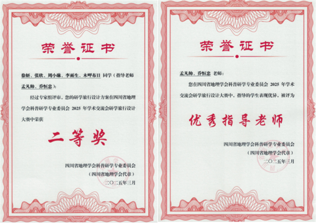 本网讯(文/徐妍,图/魏薇)3月29日,由四川省地理学会科普研学专业委员会主办的研学旅行设计大赛在绵阳师范学院圆满落幕。由贝博官网BB贝博艾弗森官方网站徐妍、张欣、周小琳、李雨生、木呷布日5名同学组成的团队在比赛中表现出色,斩获二等奖,指导教师孟凡帅、乔恒忠荣获“优秀指导老师”奖。