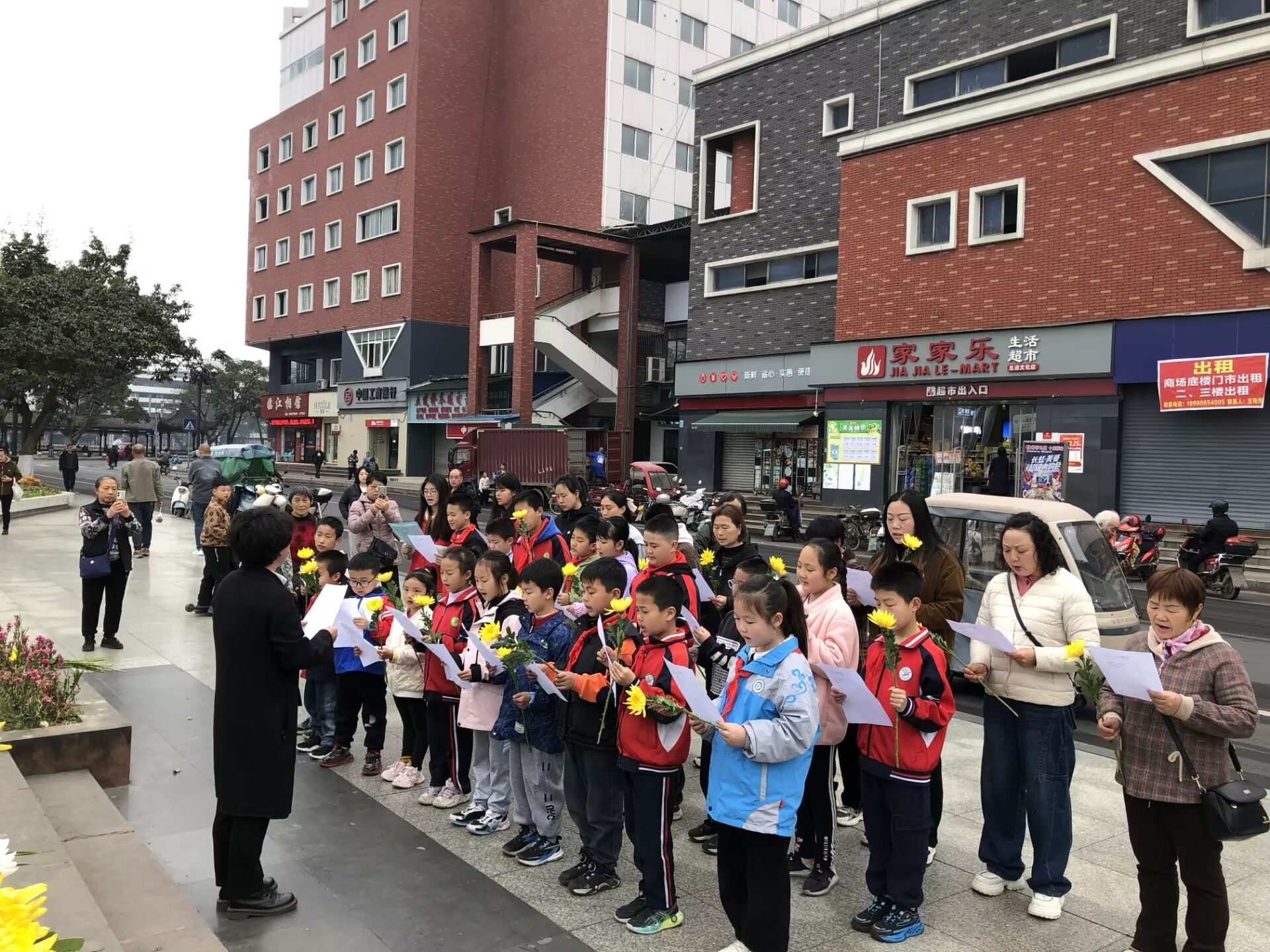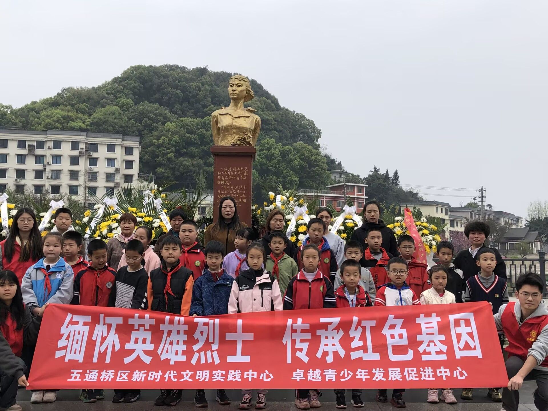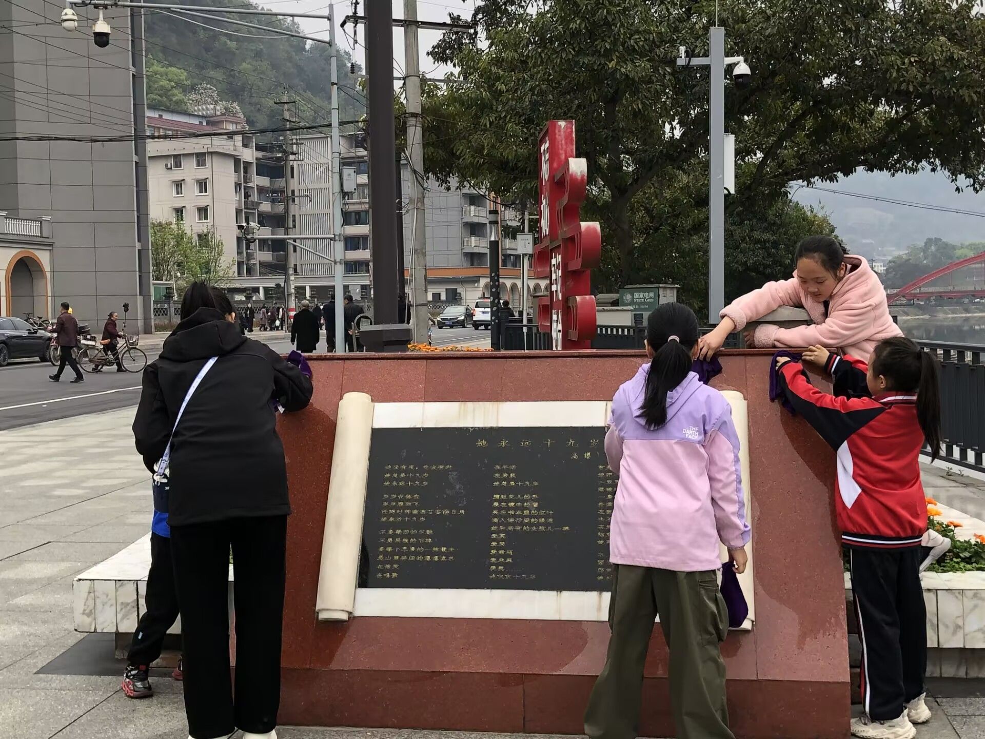 上午9时,纪念活动在庄严肃穆的氛围中开始。师生志愿者们首先通过历史影像资料,向小朋友们讲述丁佑君烈士“十九岁的永恒青春”——这位年轻的女共产党员1950年为保护国家粮仓壮烈牺牲的事迹。在《献花曲》伴奏下,由旅地学院学生党员和青龙村儿童代表组成的仪仗队,缓步走向烈士铜像敬献花篮。全体人员手持白色菊花,依次鞠躬献花,并以集体朗诵原创诗歌《青春的火炬》致敬英烈。“您用生命点燃的火炬,照亮我们前行的道路……”随后,志愿者带领孩子们开展“三个一”实践活动:用红绸布擦拭烈士铜像、朗读丁佑君烈士家书摘选、以“我心中的英雄”为主题创作。“姐姐,我画的是丁阿姨保护粮仓的样子!”7岁的王梓涵举着自己的画说道。活动现场还设置了“红色记忆知识竞答”互动环节。