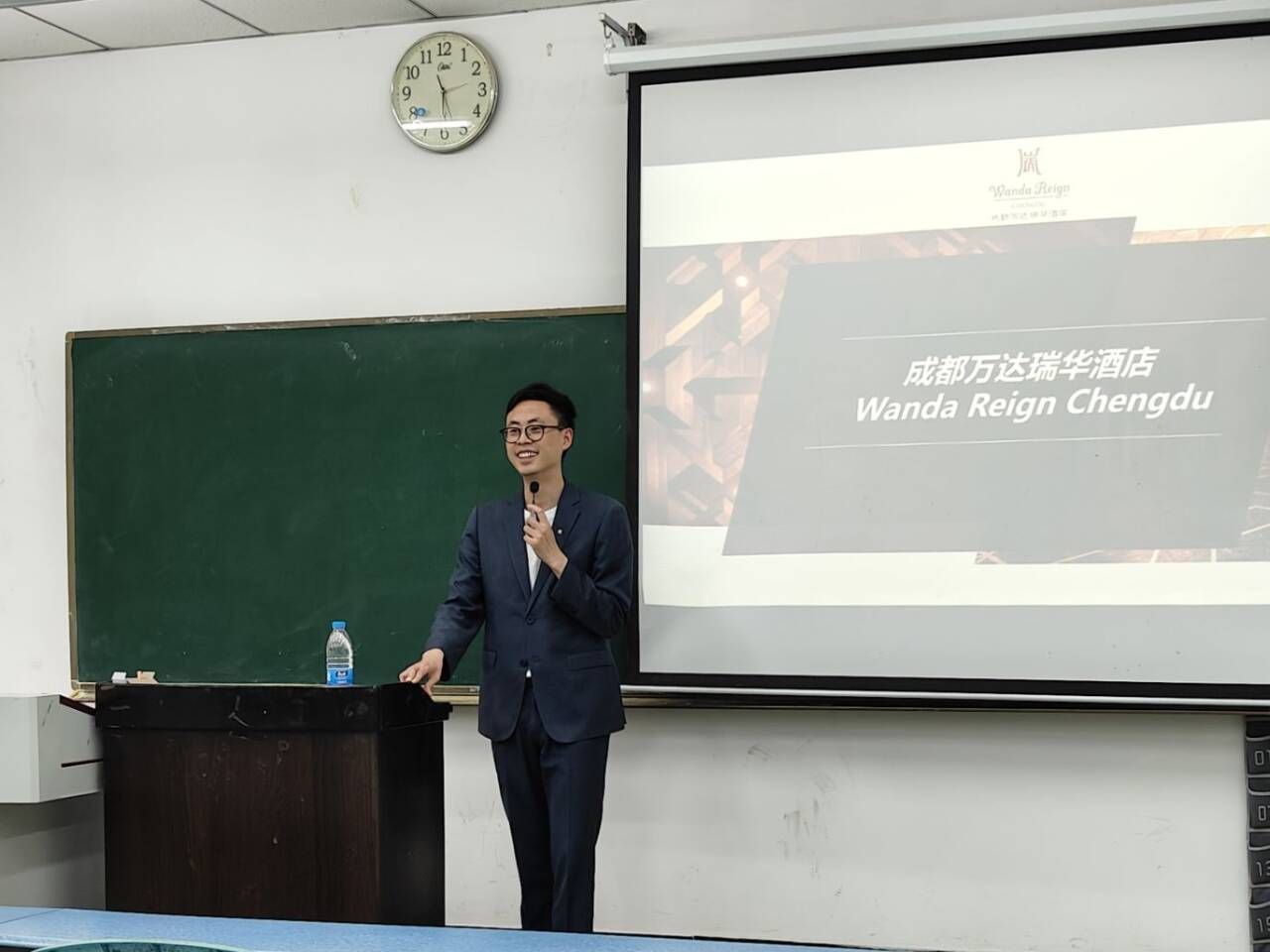 本网讯(文、图/赵茂秋)5月15日,BB贝博艾弗森官方网站于行知楼110教室成功举办了以酒店实习指导与行业认知交流为主题的培训暨访企拓岗活动。此次活动特别邀请了成都万达瑞华酒店人力资源总监杨弘光作为主讲嘉宾,为2022级酒店管理专业学生带来了一场主题为“高端酒店的职业密码——从校园到瑞华的成长路径”的精彩培训。活动由学院辅导员郑曾俊主持。