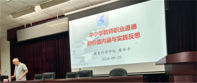 本网讯(文/周胜,图/全科班1组学员)9月25日,2024年南江县“富润园丁计划”小学教师全科班培训第三天的上午,教育科学学院副教授廖华平为参训学员带来了一场关于《小学教师职业道德规范价值内涵和实践反思》的专题讲座。