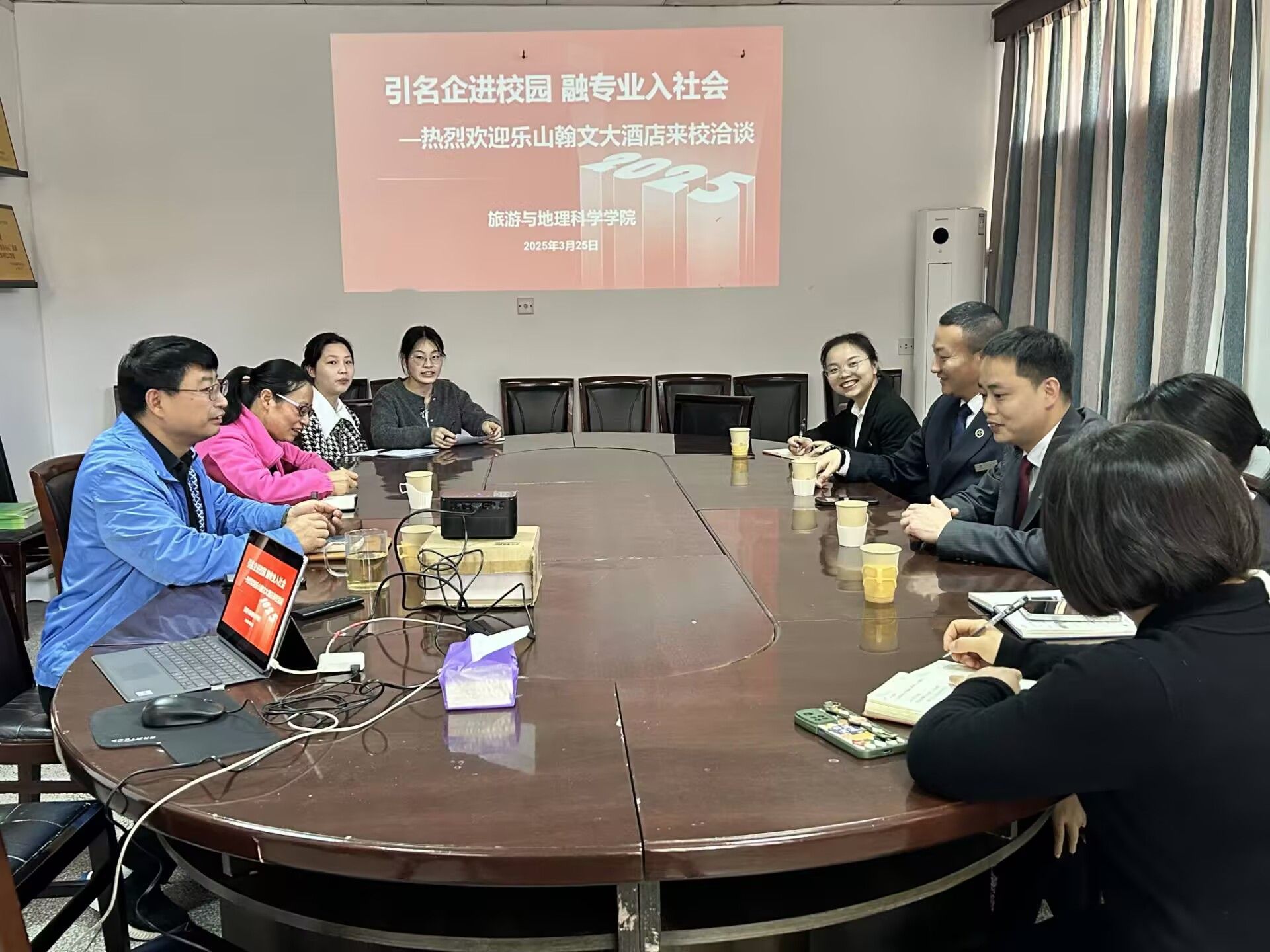 本网讯(文/刘涛 图/杨洋、卿婷)3月25日,BB贝博艾弗森官方网站与乐山高新翰文大酒店在学院二楼会议室洽谈校企合作事宜。学院院长郭剑英、副院长孙永兴等与酒店人力资源总监张威一行就深化产教融合进行深入交流。