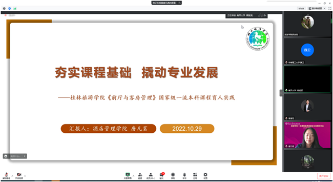 本网讯(文、图/薛文娟)10月29日,南开大学旅游与服务学院举办“旅游学科一流课程高质量建设与发展研讨会”在线会议,BB贝博艾弗森官方网站院长郭剑英、酒店管理系主任秦容等老师参加了本次会议。