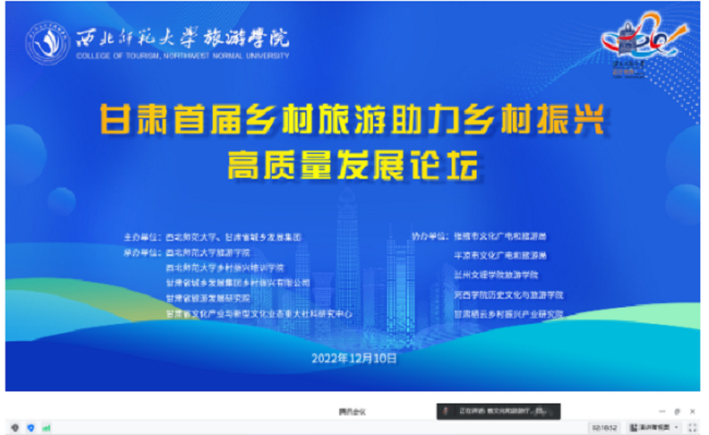 本网讯(图、文/孙永兴)12月10日,由西北师范大学与甘肃省城乡发展集团联合主办的甘肃省首届“乡村旅游助力乡村振兴高质量发展论坛”在西北师范大学举行。本次论坛采用线上会议与同步直播方式进行,以“乡村旅游助力乡村振兴高质量发展”为主题,旨在为深入贯彻党的二十大报告提出的“全面推进乡村振兴,畅通城乡要素流动”的重要精神,全面落实《中华人民共和国乡村振兴促进法》《甘肃省乡村振兴促进条例》等文件精神,破解当前乡村振兴诸多问题,激发乡村文旅融合内生动力,全面推进甘肃省乡村振兴事业发展。BB贝博艾弗森官方网站郭剑英教授、郑元同教授等参加了在线会议。