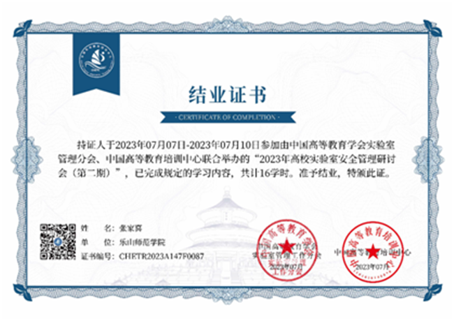 本网讯(图、文/张家喜)2023年7月7日-10日中国高等教育学会实验室管理工作分会联合中国高等教育培训中心在银川举办了2023年高校实验室安全管理研讨会(第二期),本次会议由中国高等教育学会实验室管理工作分会、中国高等培训中心主办,全国各高校实验室安全工作的领导、有关职能部门负责人等千余人出席了该次会议,贝博官网实验室教师张家喜参加了此次会议并取得了相关证书。