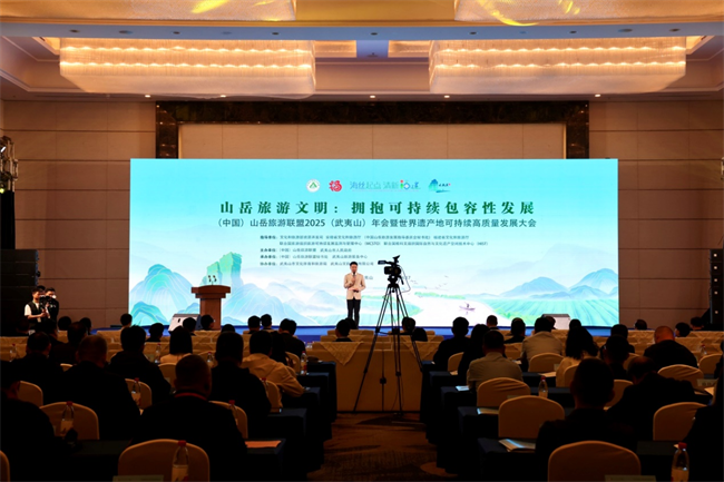 本网讯(图、文/郭剑英)4月16日至18日,(中国)山岳旅游联盟2025(武夷山)年会暨世界遗产地可持续高质量发展大会在武夷山召开,会议以“山岳旅游文明:拥抱可持续包容性发展”为主题,深入践行习近平文化思想、习近平生态文明思想以及习近平总书记对旅游工作作出的重要指示精神,全面贯彻全国旅游发展大会精神,学习借鉴武夷山双重世界遗产地实践探索成果,坚持守正创新、提质增效、融合发展,在统筹生态保护、绿色发展、民生改善中推进旅游业可持续包容性高质量发展。南平市委常委、武夷山市委书记杨青建,安徽省文化和旅游厅一级巡视员王靖,中央文化和旅游管理干部学院院长马峰出席活动并致辞。福建省文化和旅游厅资源开发处一级调研员文刚出席活动。此次大会汇聚了国内众多世遗景区、山岳景区以及旅行商、文旅综合体等行业负责人和知名专家学者。BB贝博艾弗森官方网站院长郭剑英参加了本次会议。