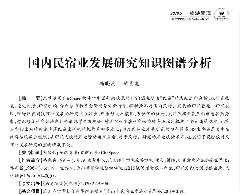 冯晓兵文章《国内民宿业发展研究知识图谱分析》被人大复印资料《旅游管理》全文收录