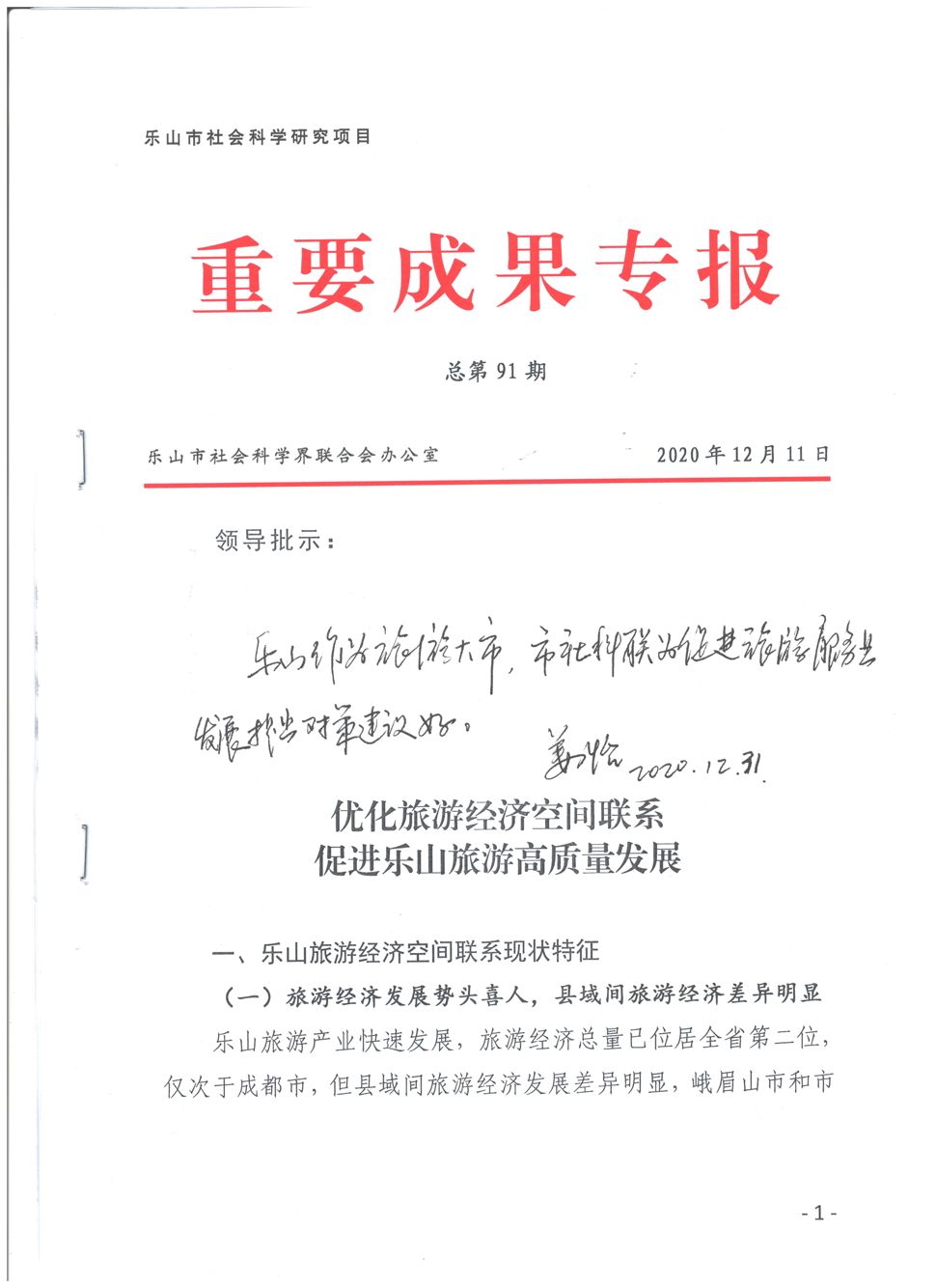 贝博官网教师冯晓兵撰写报送的《优化旅游经济空间联系 促进乐山旅游高质量发展》在乐山市社会科学界联合办公室主办的重要成果专报第91期刊出,得到四川省社会科学界联合会党组书记姜怡批示“乐山作为旅游大市,市社科联为促进旅游服务业发展提出对策建议好”。