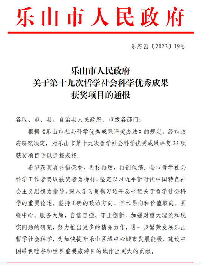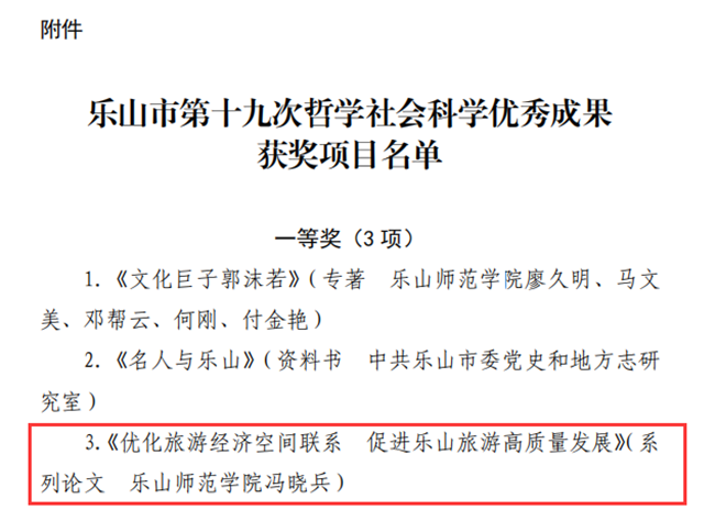 本网讯(图、文/薛文娟)近日,乐山市人民政府公布了乐山市第十九次哲学社会科学优秀成果获奖项目名单。其中,贝博官网冯晓兵副教授题为《优化旅游经济空间联系 促进乐山旅游高质量发展》的系列论文荣获一等奖。