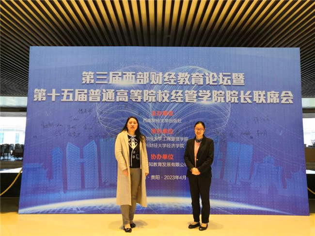 本网讯(图、文/丁银平)3月31日—4月2日,由西南财经大学出版社主办、贵州财经大学工商管理学院、经济学院承办的第三届西部财经教育论坛暨第十五届普通高等院校经管学院院长联席会在贵阳召开。BB贝博艾弗森官方网站院长郭剑英教授、丁银平博士参加了本次会议。