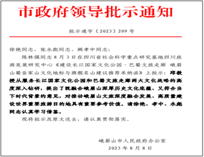 本网讯(图、文/钟晓岚)由四川旅游发展研究中心推荐的贝博官网BB贝博艾弗森官方网站邱云志教授撰写的“建设长江国家文化公园•巴蜀文旅走廊峨眉山蜀岳家山文化地标与旗舰名山建议”,于2023年8月3日经峨眉山市人民政府市长陈林强同志签署如下意见:“邱教授从服务长江国家文化公园和巴蜀文旅走廊两大文化战略的高度深入钻研,提出了既融合峨眉山深厚历史文化底蕴、又符合当下时代背景的意见,对推动峨眉山文旅深度融合发展、高质量建设世界重要旅游目的地具有重要参考价值。”峨眉山市人民政府办公室8月8日以“市政府领导批示通知(批示通字〔2023〕209号)”名义将陈市长的签批意见转发峨眉山市委、市政府和峨眉山景区管委会相关领导,要求予以借鉴和贯彻落实。