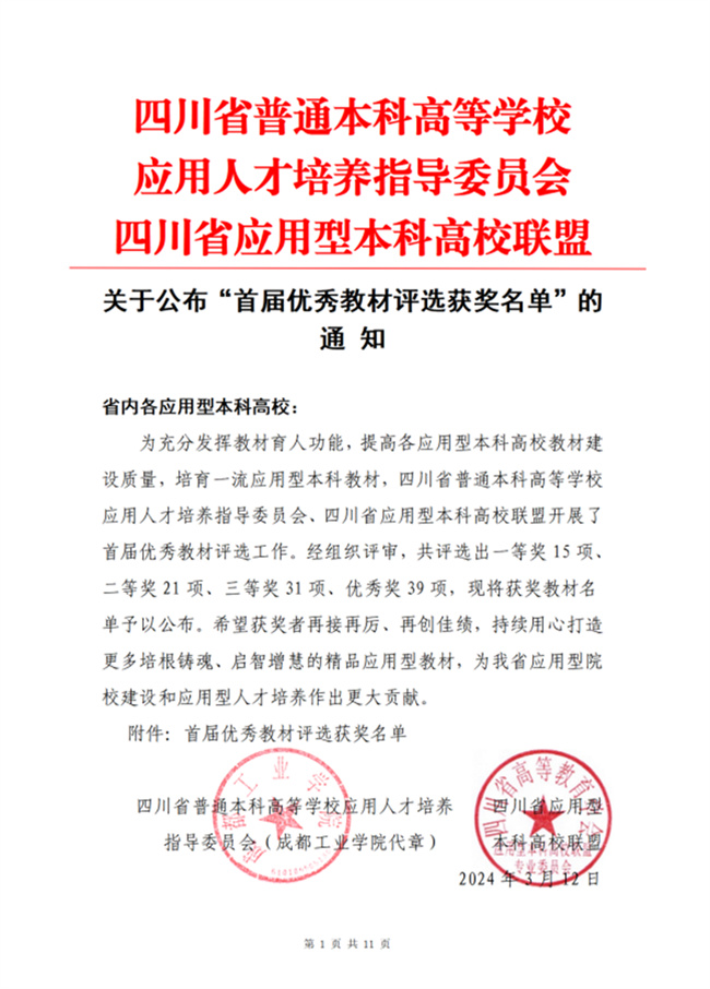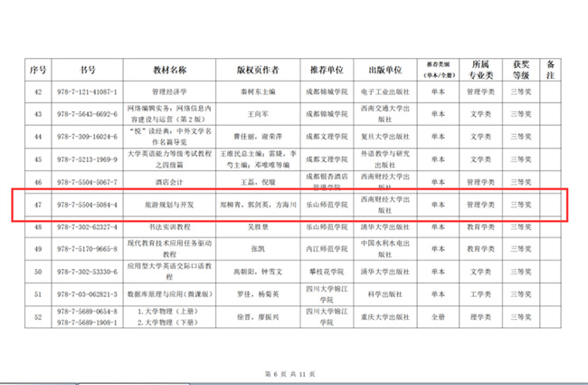本网讯(图、文/郑柳青)近日,四川省普通本科高等学校应用人才培养指导委员会、四川省应用型本科高校联盟公布了首届优秀教材评选获奖名单。BB贝博艾弗森官方网站郑柳青、郭剑英、方海川主编的教材《旅游规划与开发》(西南财经大学出版社,2022 年1 月出版)荣获三等奖。