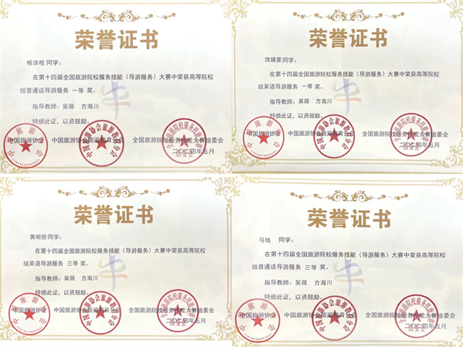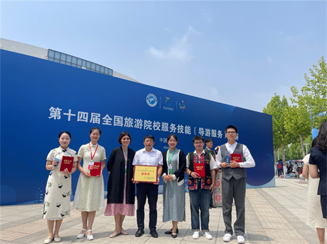 本网讯(图、文/吴薇)5月23日-26日,由文化和旅游部市场管理司、中国旅游协会指导,中国旅游协会旅游教育分会主办,郑州旅游职业学院承办的第十四届全国旅游院校服务技能(导游服务)大赛在郑州举行。经过几天的激烈角逐,贝博官网四名选手再创佳绩,获得普通话、英语导游服务一等奖各1项、三等奖各1项的佳绩;在全国232所高等院校中,贝博官网参赛队以总分排名第十九的好成绩荣获团体奖。
